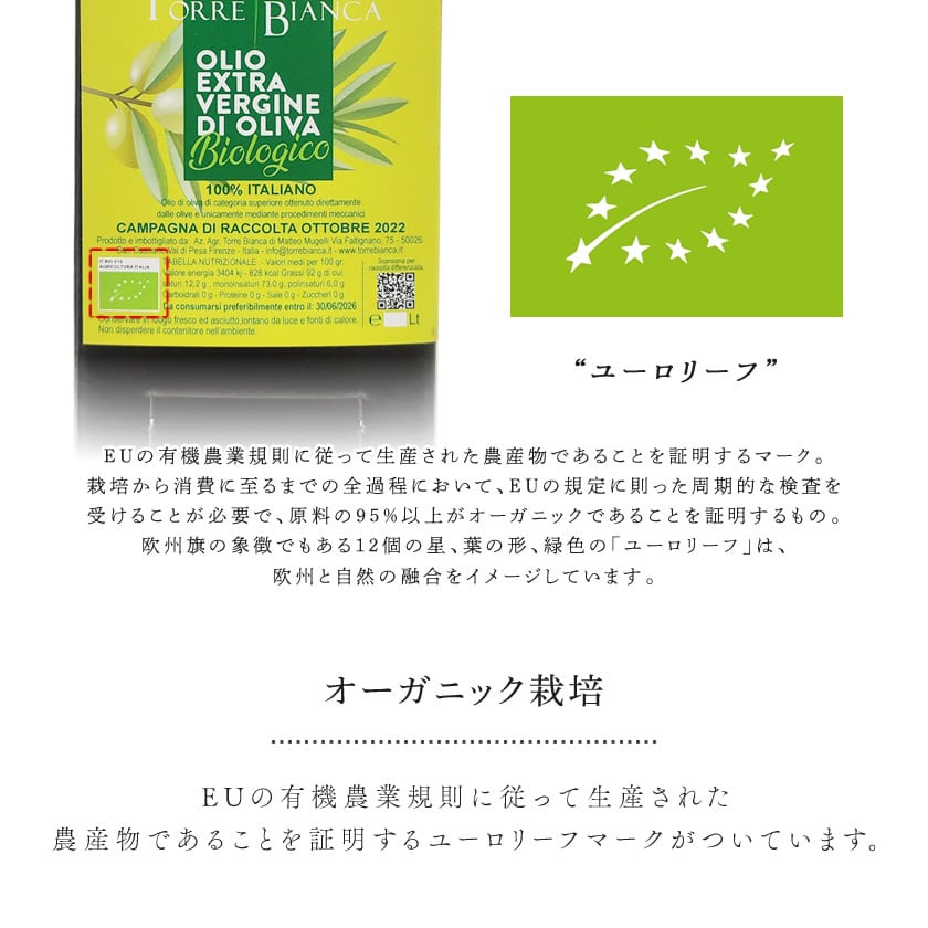 EUの有機農業規則に従って生産された農産物であることを証明するユーロリーフマークがついています。
