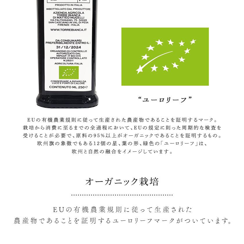 EUの有機農業規則に従って生産された農産物であることを証明するユーロリーフマークがついています。